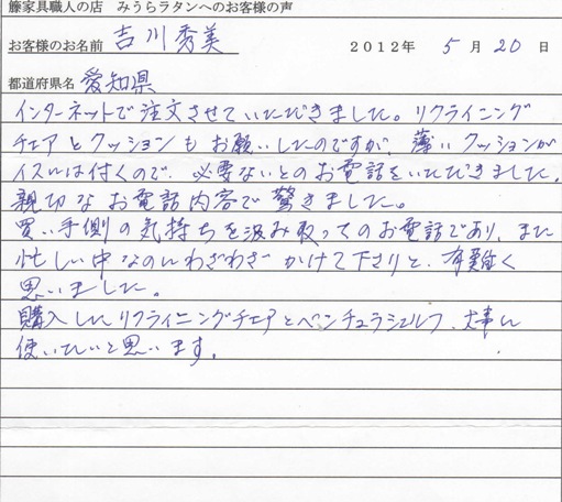 先日はリクライニングチェア、シェルフのお買い上げ誠にありがとうございました。