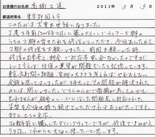 籐家具のご購入、修理、家具のリメイクなど様々な用途でみうらラタンをご利用頂いたお客さまの声をご紹介いたします。