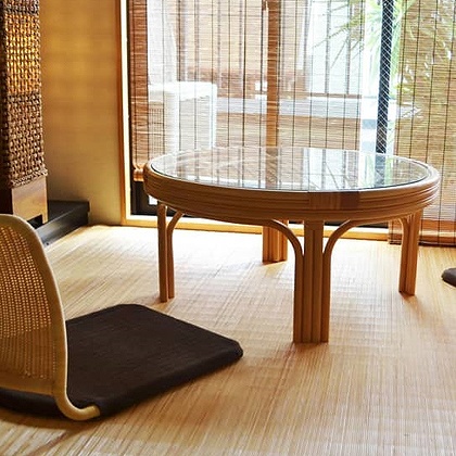 ナチュラル色の籐こたつテーブルには、「和座(わざ)座椅子」をセットで。