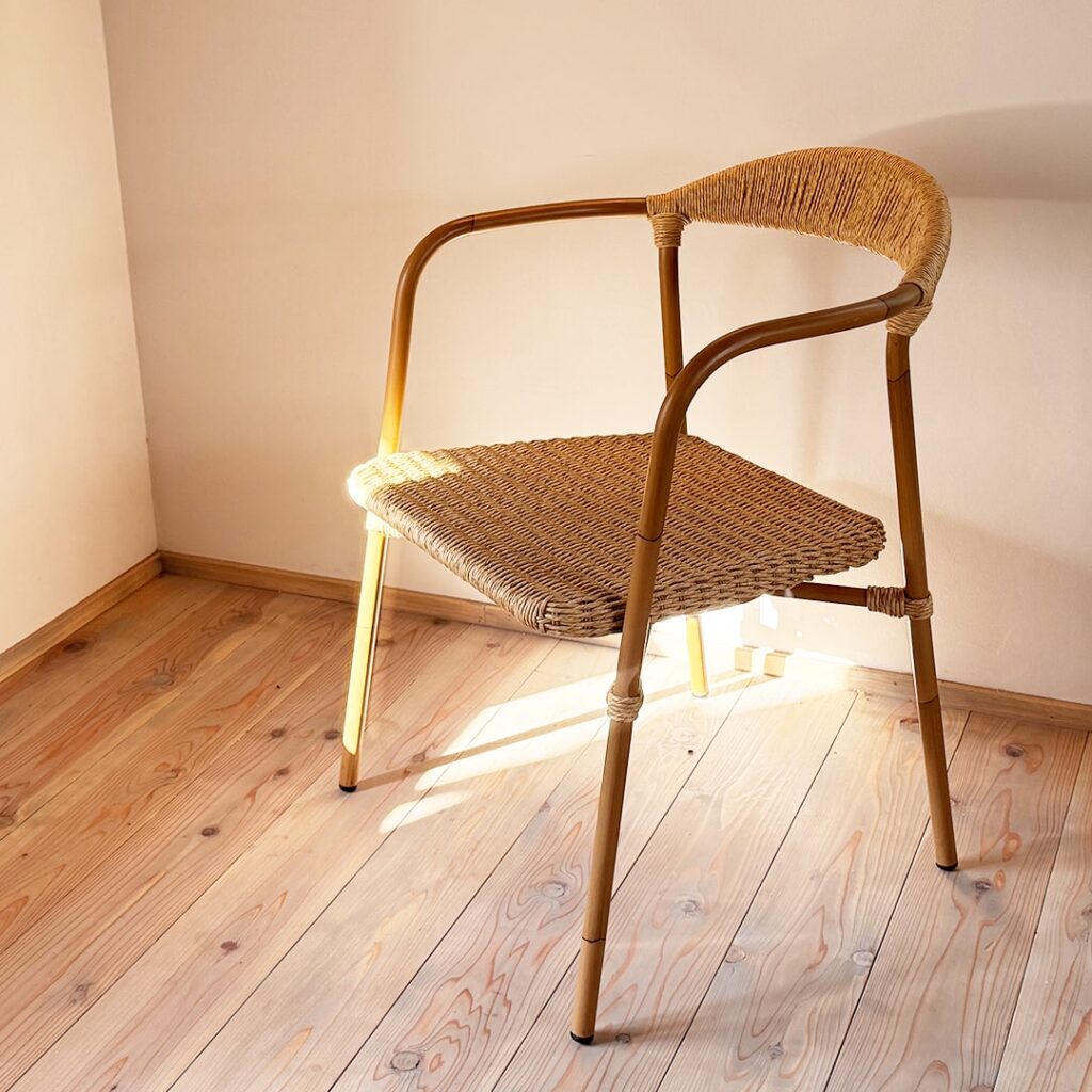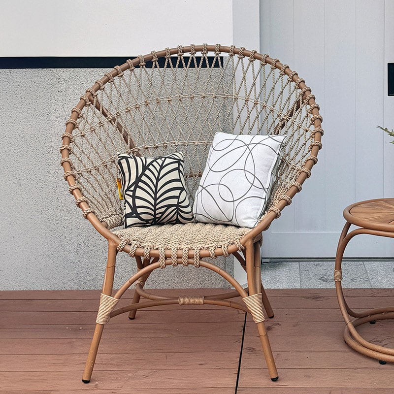 座面ロープ編み、包み込まれるような、ここちよい座り心地のラウンドチェアです。