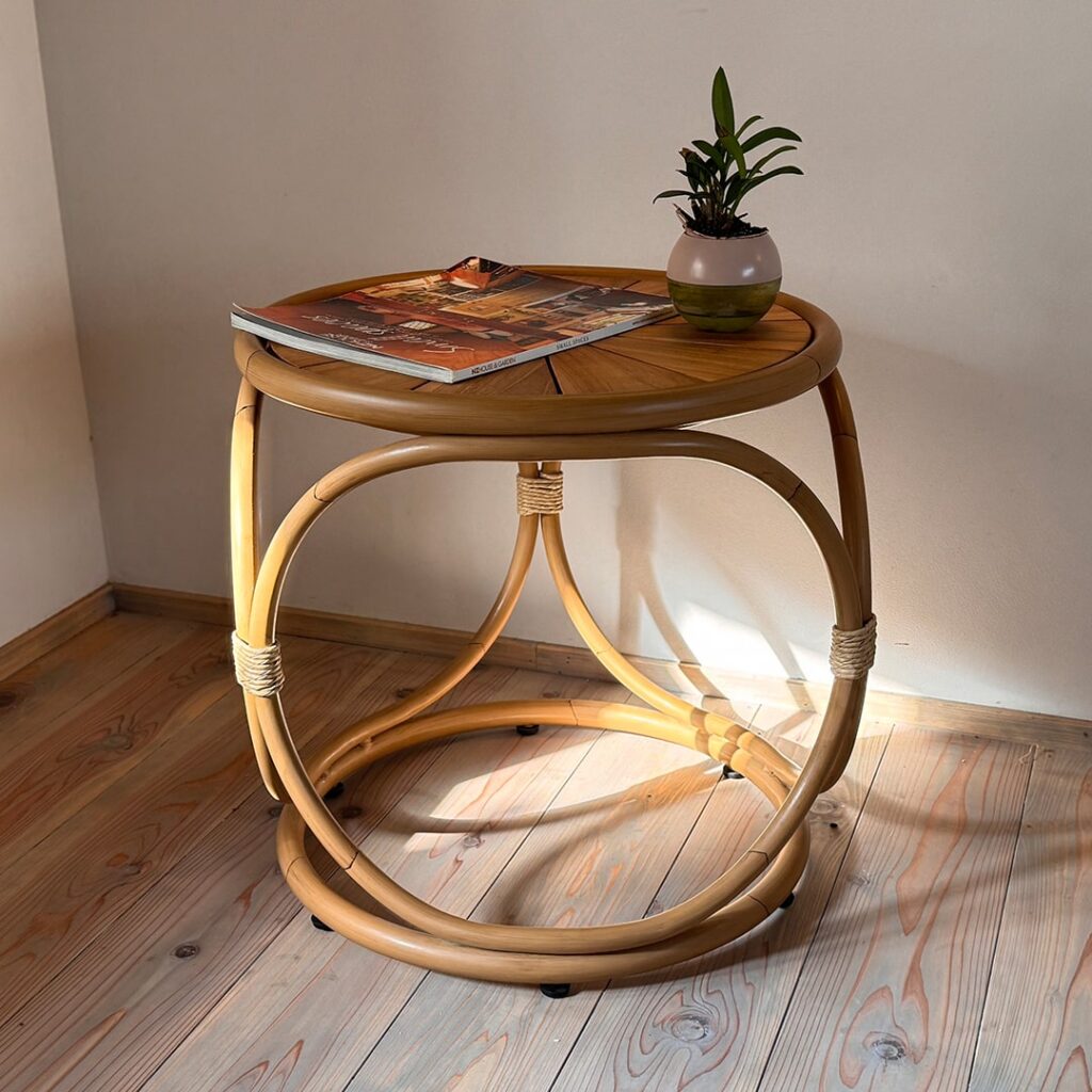 天然素材の美しさと耐久性に優れたチーク材トップのサイドテーブル。Nawaシリーズのチェアとのコーディネートに最適です。