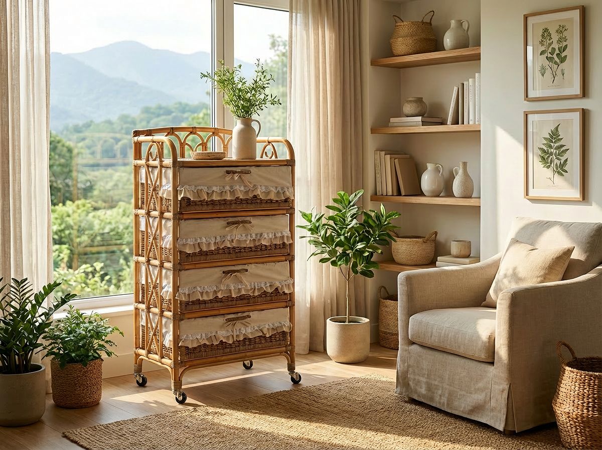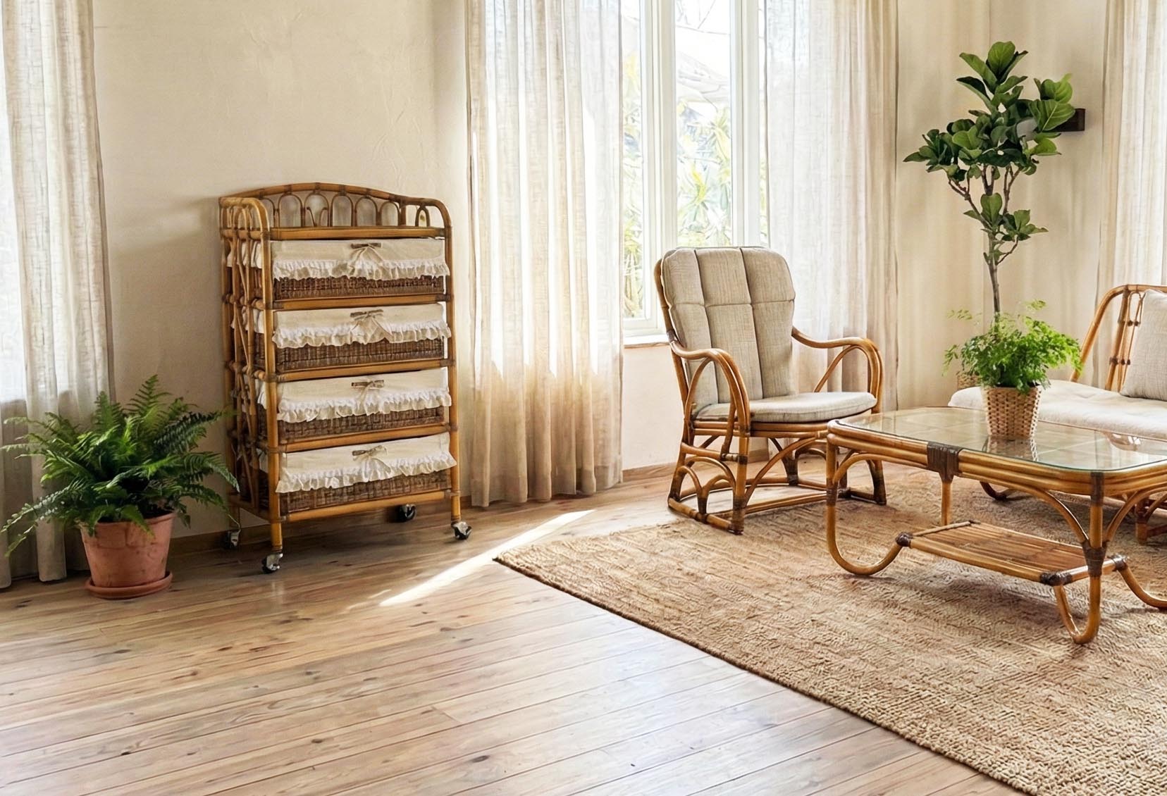 引き出し部分は天然素材のラタン編みのため、フリル無しでご使用になる場合は、お使いになるうちに、毛羽立ちやささくれが気になる場合があります。その場合は、ささくれをはさみや爪切りなどでカットしてお使いください。