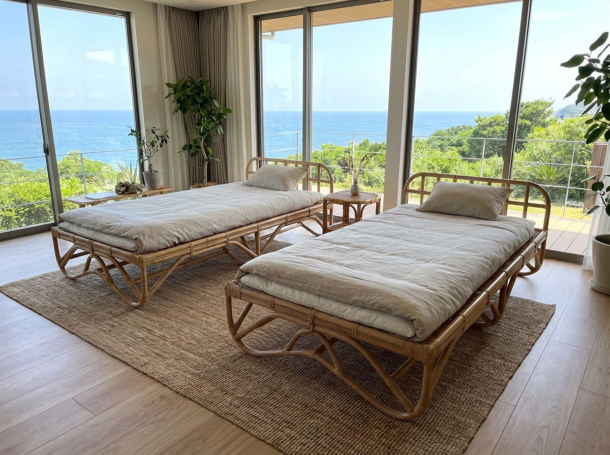 当店の籐ベッドはお布団を直接敷いてご利用できますので重たいマットを使用しなくても軽やかで、快適に過ごせます。