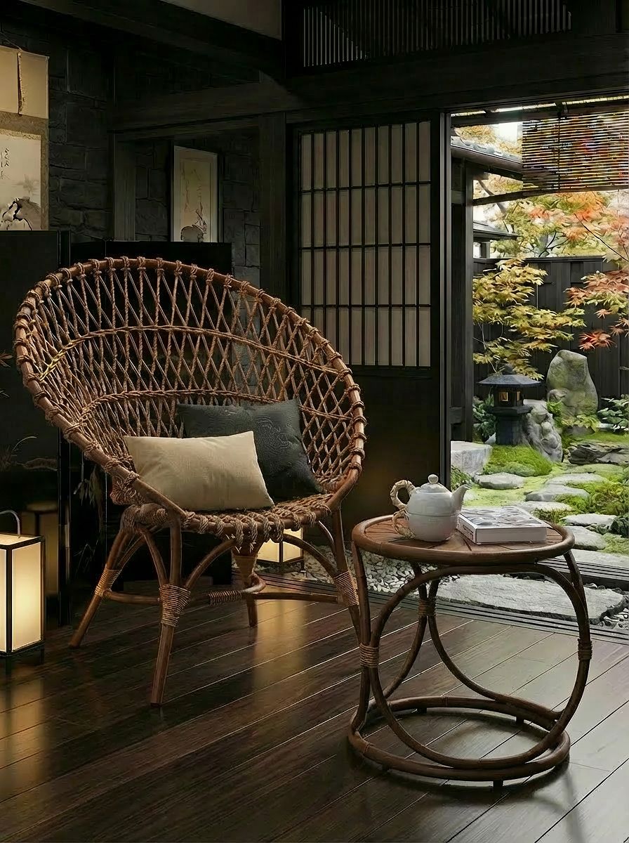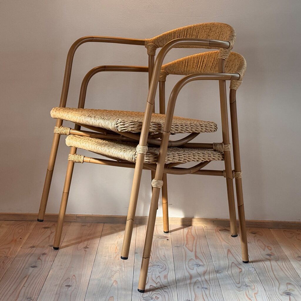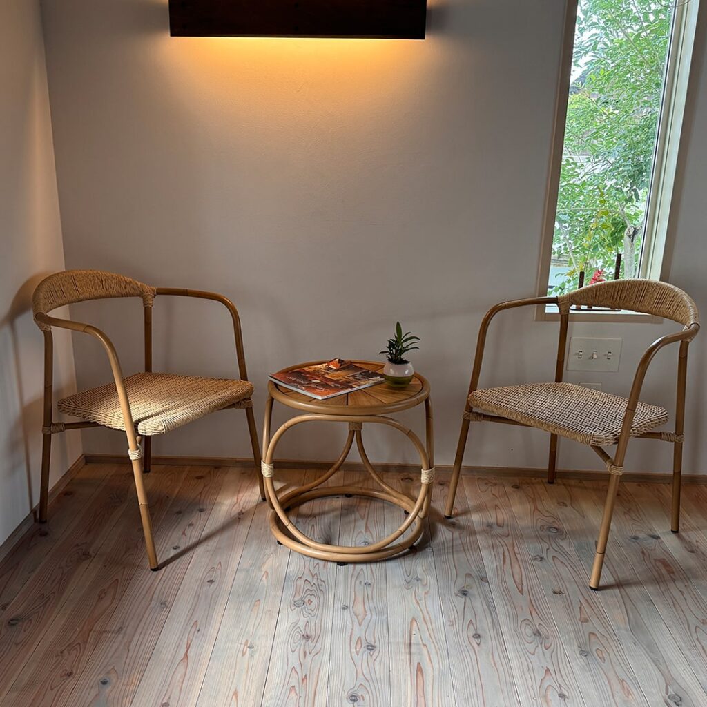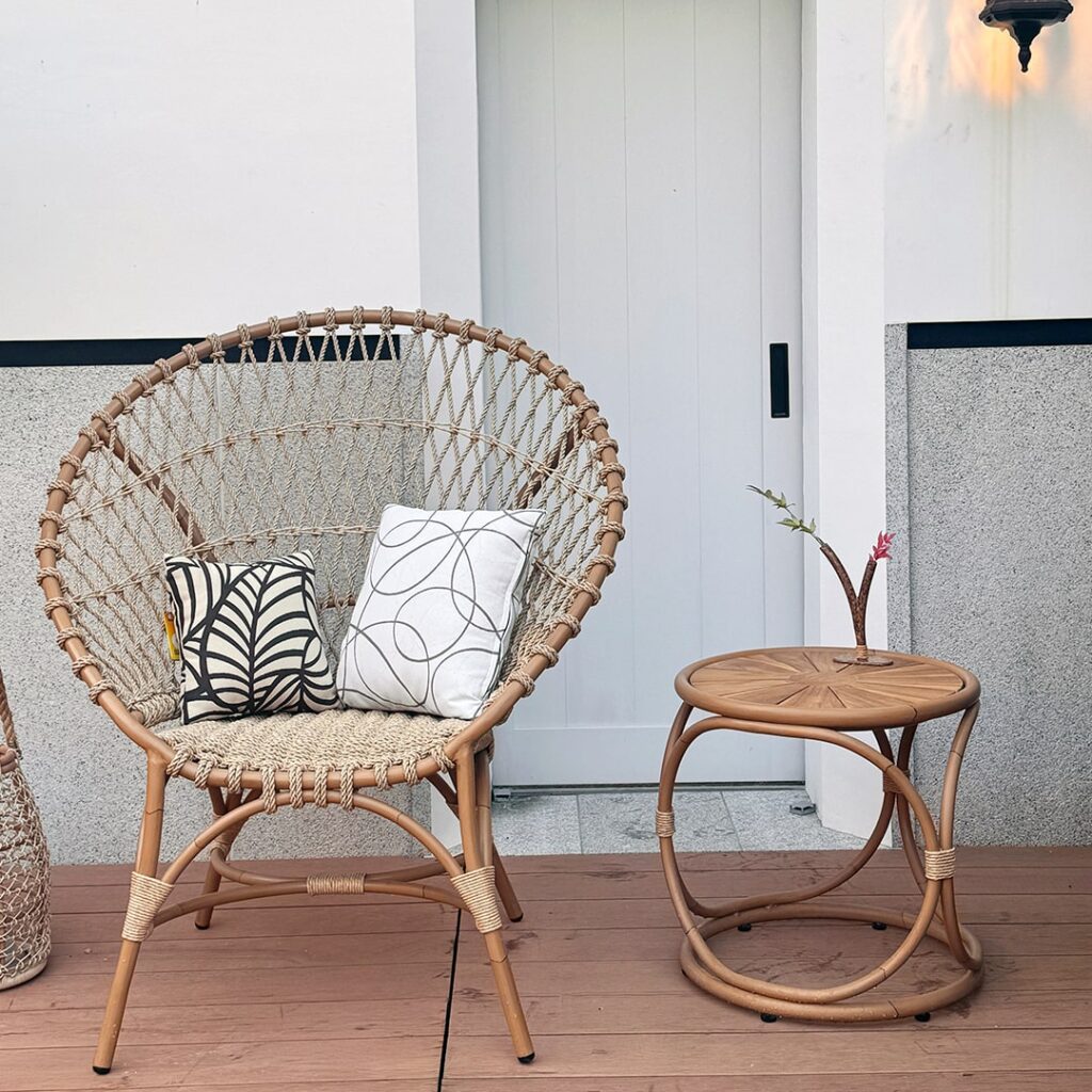 座面ロープ編み、包み込まれるような、ここちよい座り心地のラウンドチェアです。