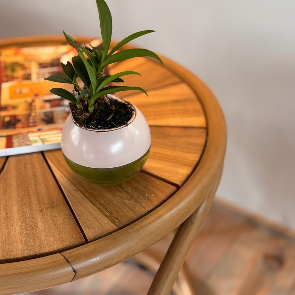 天然素材の美しさと耐久性に優れたチーク材トップのサイドテーブル。Nawaシリーズのチェアとのコーディネートに最適です。