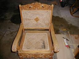 座はわらで編んであるものでしたが、籐のピールでヨーロッパのおしゃれな椅子に編み込む手法の、木目網代ですっきり、シャープな仕上りになりました。